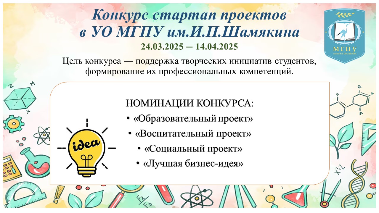С 24.03.2025 по 14.04.2025 в УО «Мозырский государственный педагогический университет имени И.П.Шамякина» проводится конкурс стартап проектов, целью которого является поддержка творческих инициатив студентов, формирование их профессиональных компетенций.
