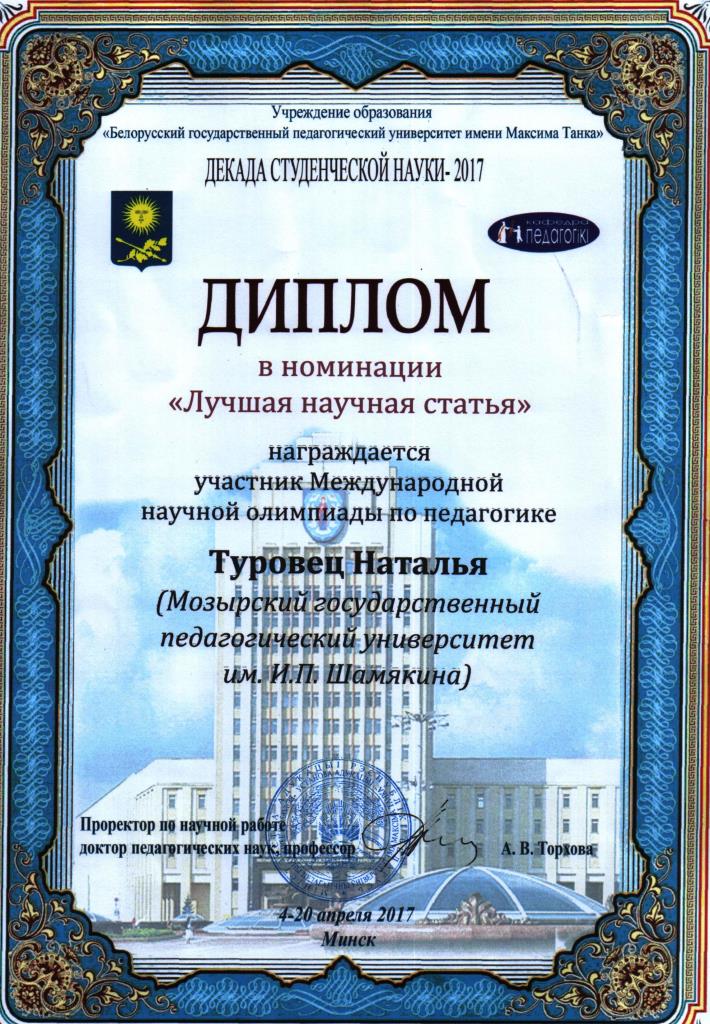 Дипломом в номинации «Лучшая научная статья» награждена Туровец Наталья, аспирант кафедры педагогики и психологии.