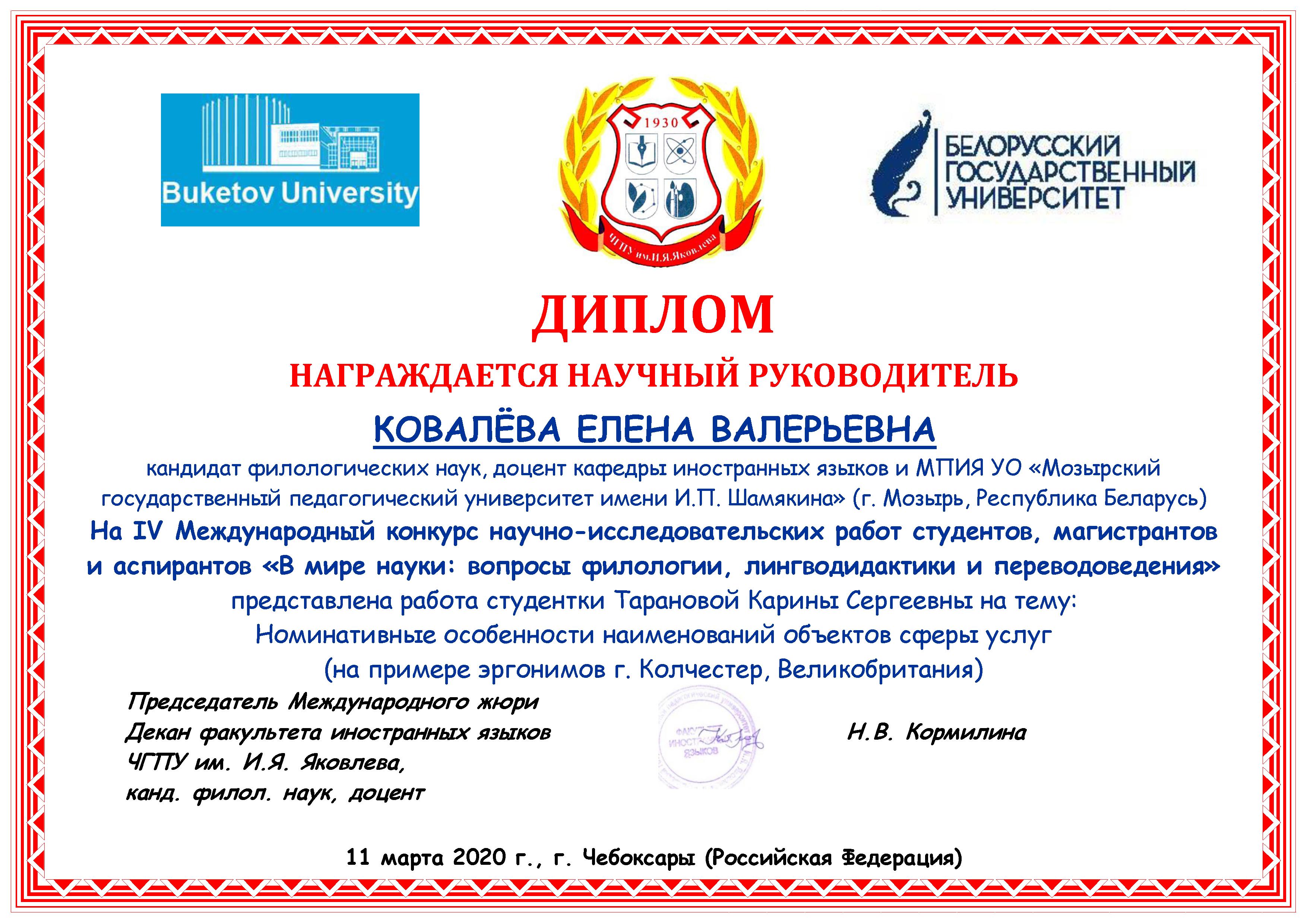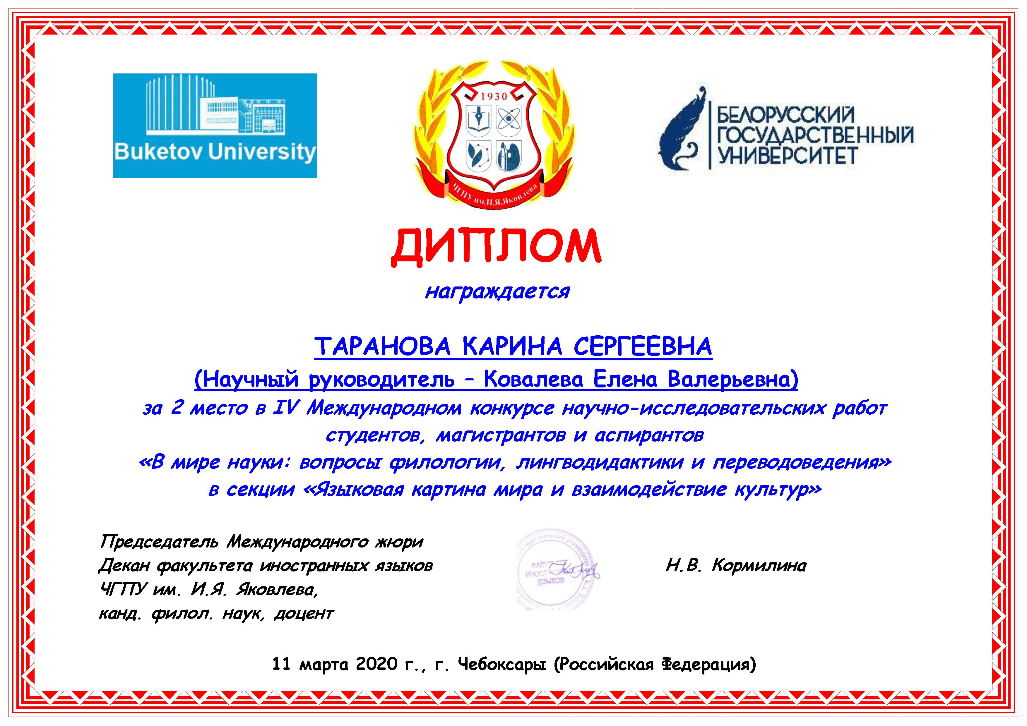 11 марта 2020 года факультет иностранных языков Чувашского государственного педагогического университета имени И. Я. Яковлева совместно с факультетом иностранных языков Карагандинского государственного университета им. академика Е.А. Букетова и кафедрой теории и практики перевода Белорусского государственного университета проводил IV заочный Международный конкурс научно-исследовательских работ студентов, магистрантов и аспирантов «В мире науки: вопросы филологии, лингводидактики и переводоведения».