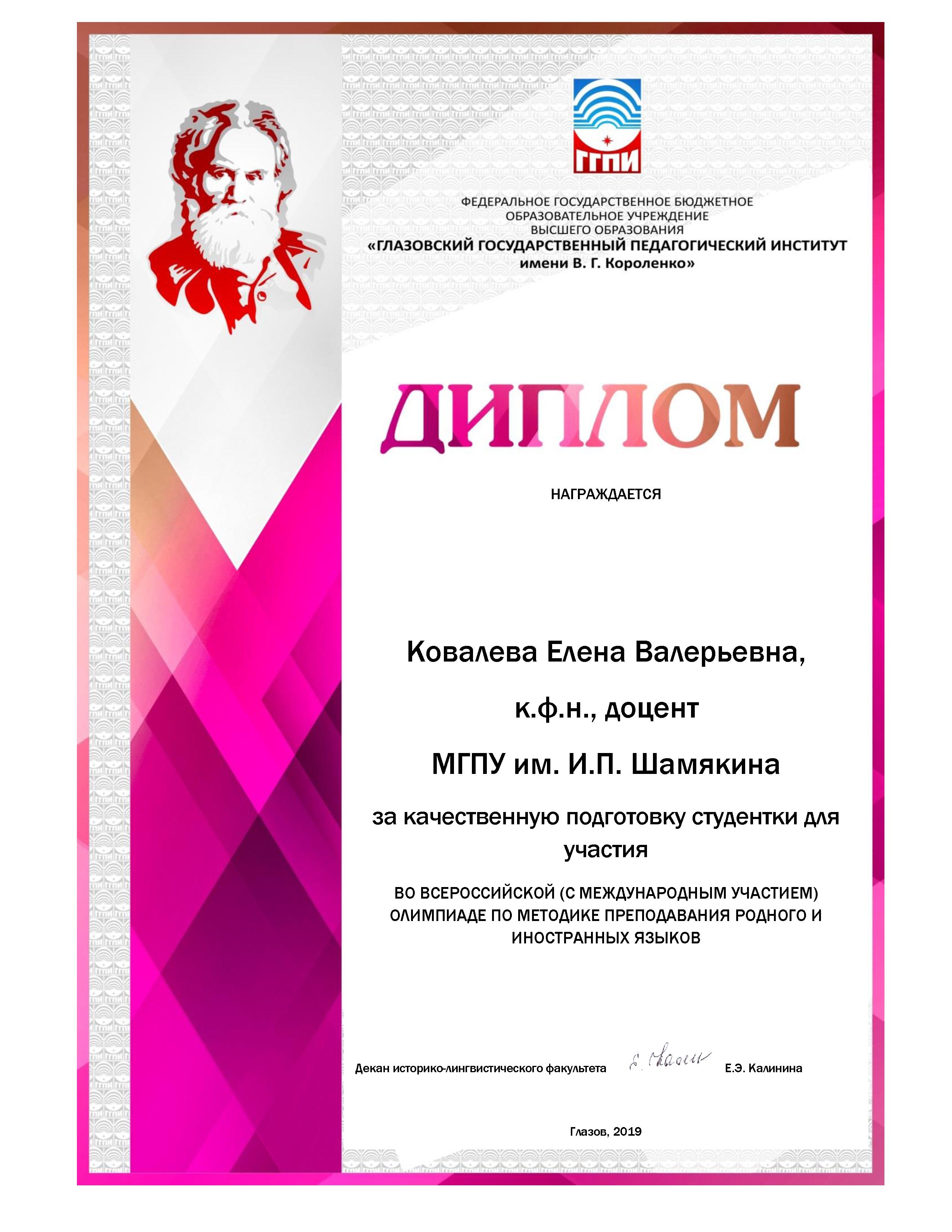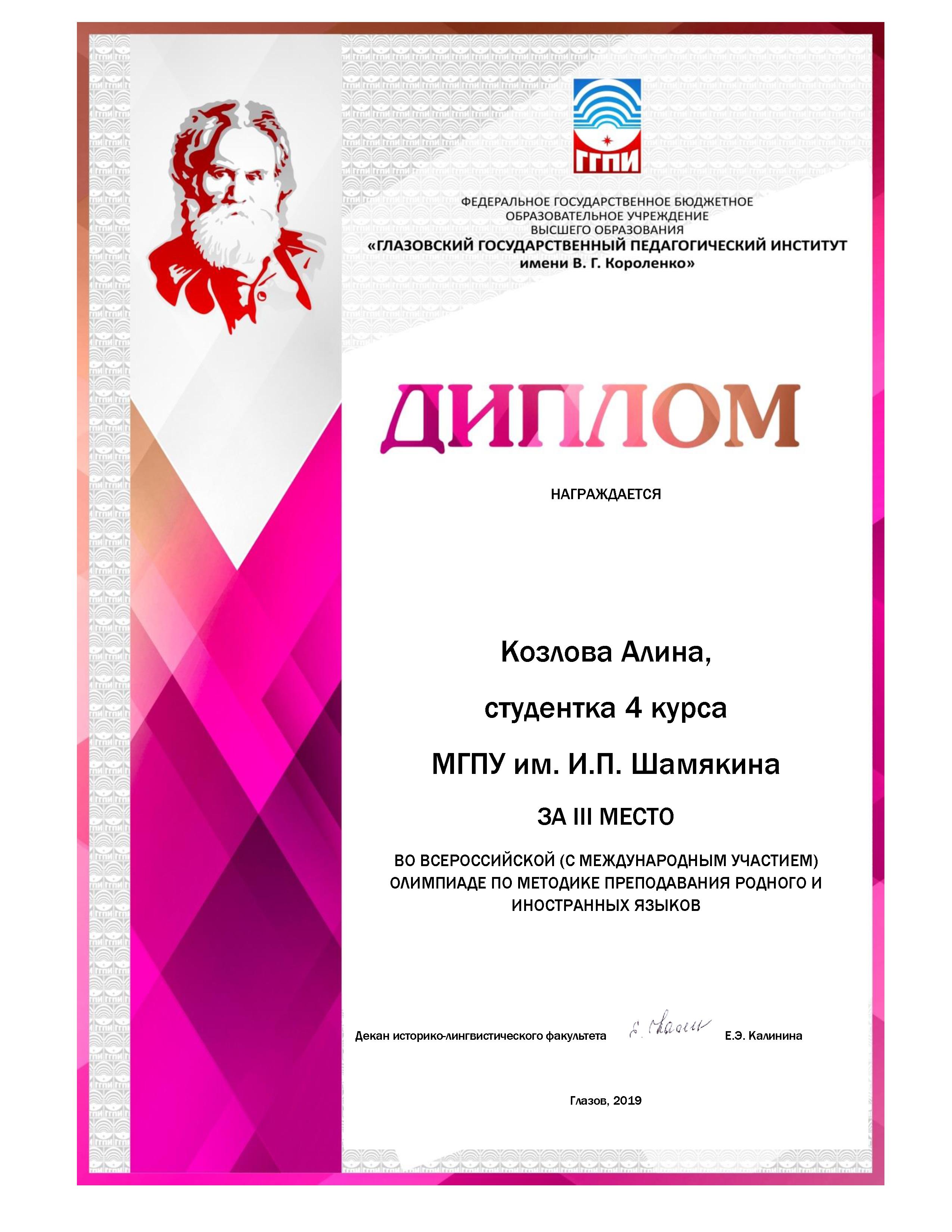 По результатам III региональной (с международным участием) студенческой олимпиады по методике преподавания родного и иностранного языков, которая проходила на базе кафедры иностранных языков и удмуртской филологии ФГБОУ ВО «Глазовский государственный педагогический институт имени В.Г. Короленко», студентка 4 курса 2 группы специальности «Иностранные языки (английский, немецкий)» Козлова Алина завоевала диплом III степени.