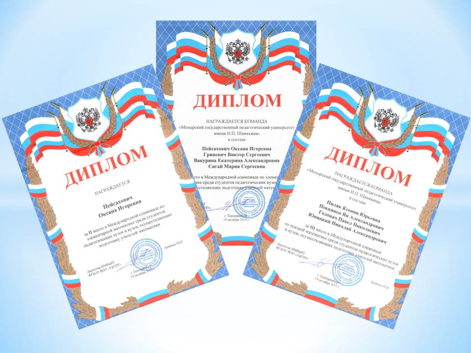 По итогам международных олимпиад по элементарной и высшей математике для студентов педвузов и вузов, осуществляющих подготовку будущих учителей математики, студенты физико-математического факультета награждены тремя дипломами. Команда МГПУ им. И.П. Шамякина заняла первое место в олимпиаде по элементарной математике, второе место в личном первенстве, третье место в олимпиаде по высшей математике.